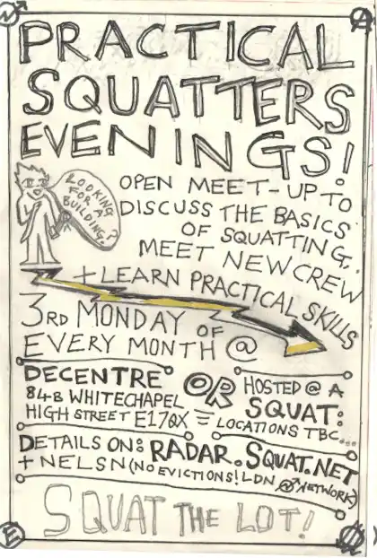The PSN are happy to come out and run practical squatting workshops and squatting legal workshops on request, whether that’s for existing squat crews or other groups of people. Please contact PSN if you’d like to arrange something like this.